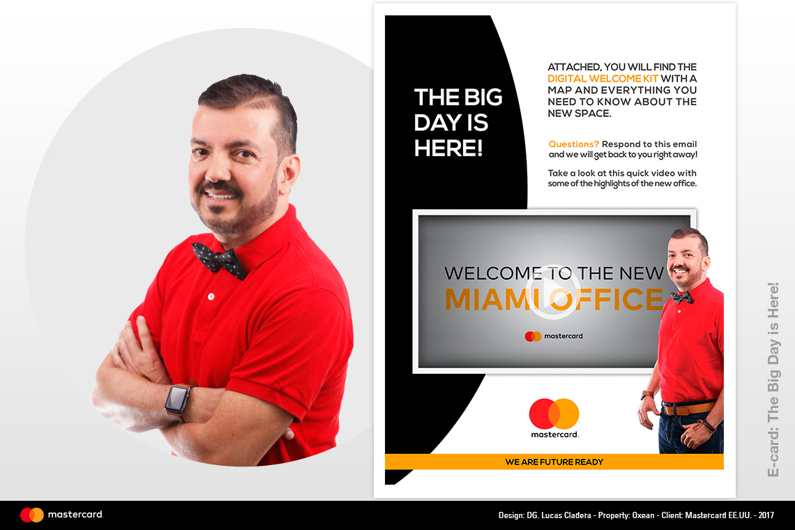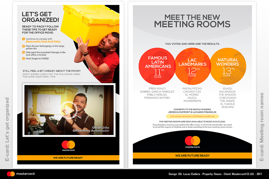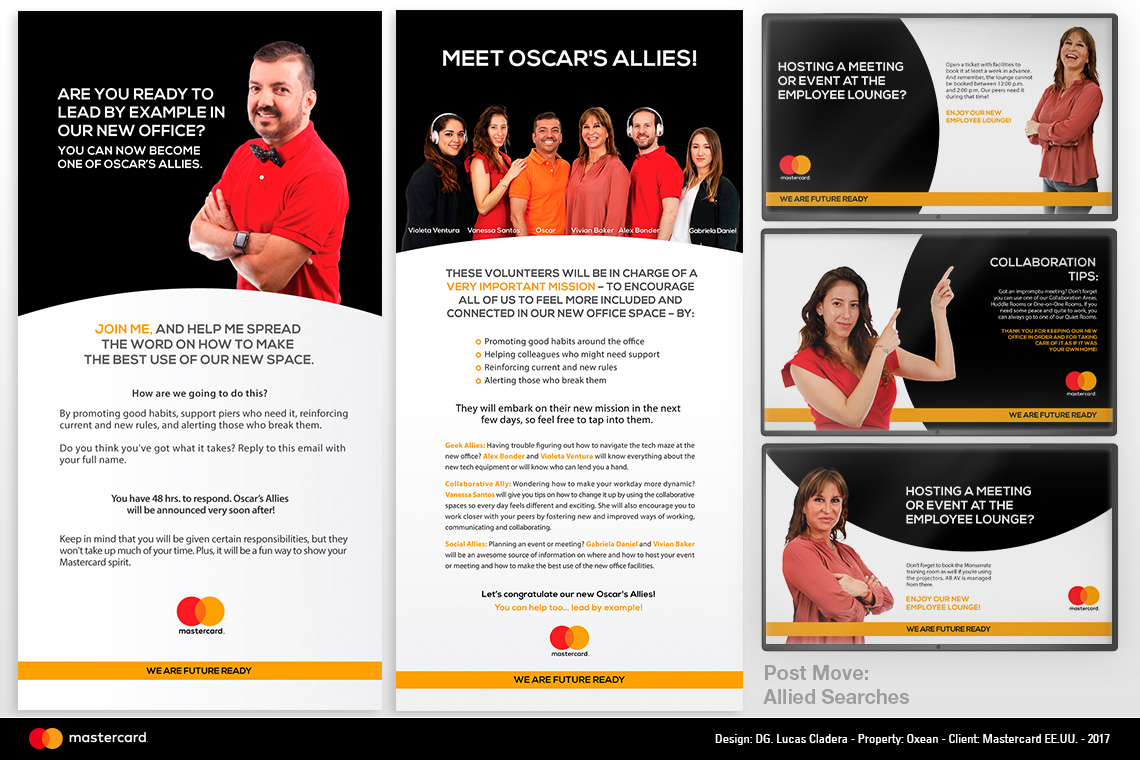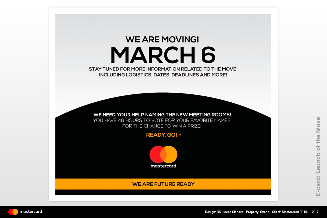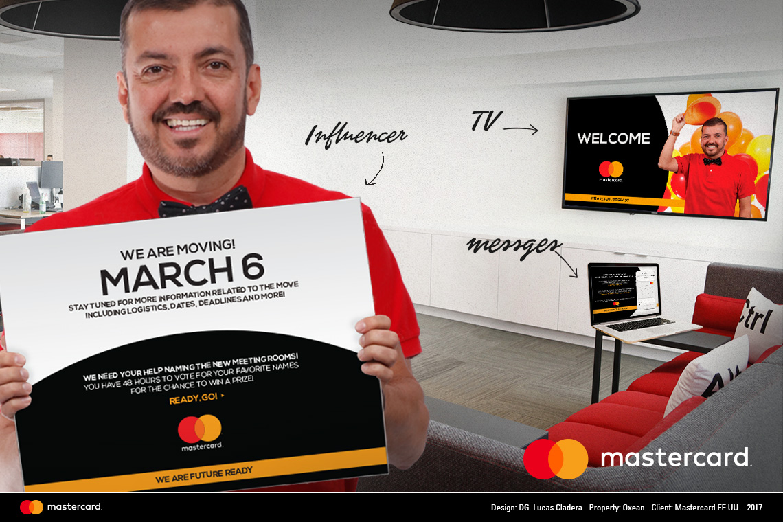 - Results: For Mastercard Miami, the relocation was more than a transfer of place. It implied a great change in the cultural concept of the company. Great success was achieved from a different and fun internal communication strategy. An ambassador (influencer) who was chosen by the employees themselves was in charge of spreading the campaign, facilitating the entire process. The campaign achieved great acceptance and enthusiasm for a new proposal and organization of the space “Moving to an open concept workspace”. A creative and outstanding proposal in internal communication that was also a candidate to participate in awards.