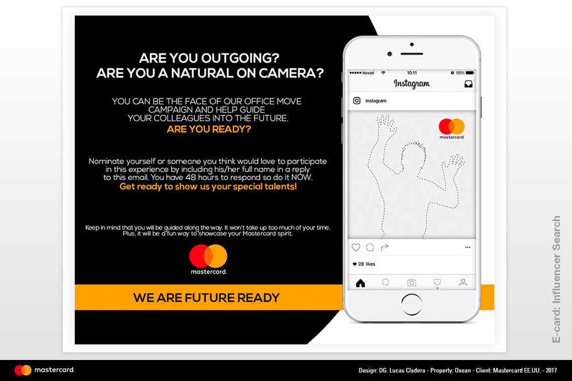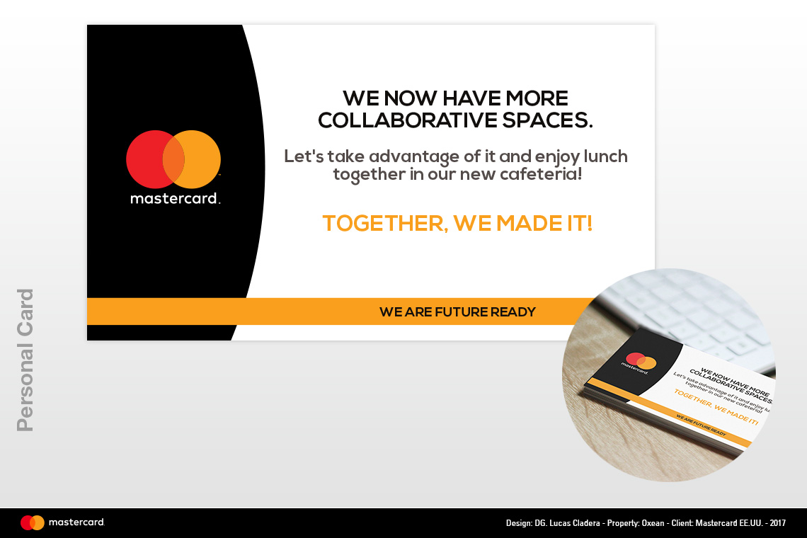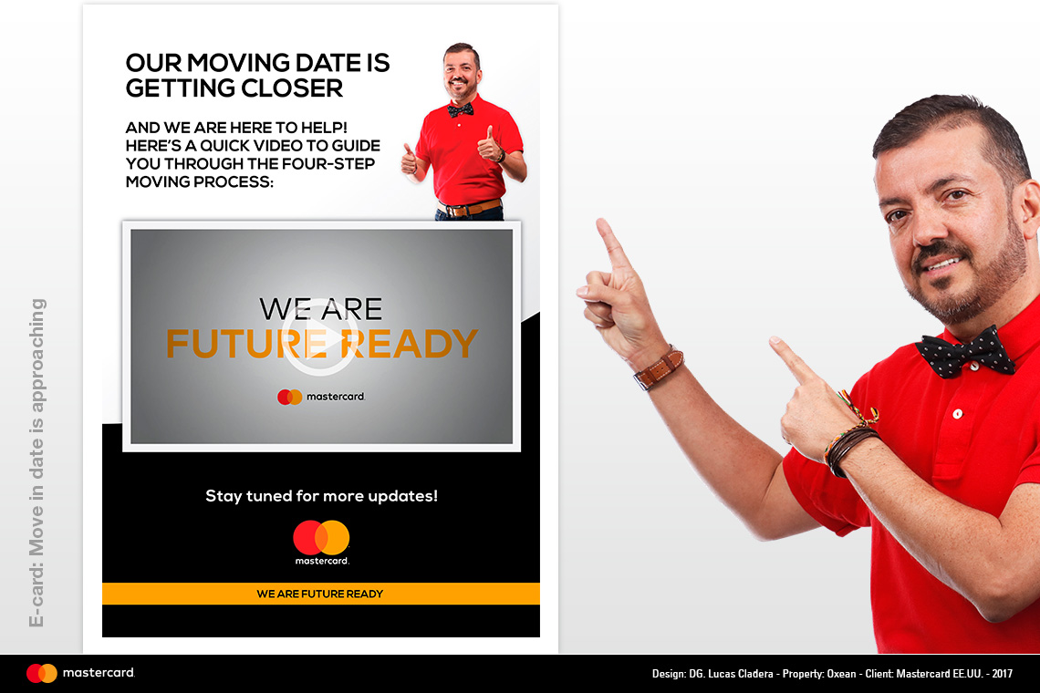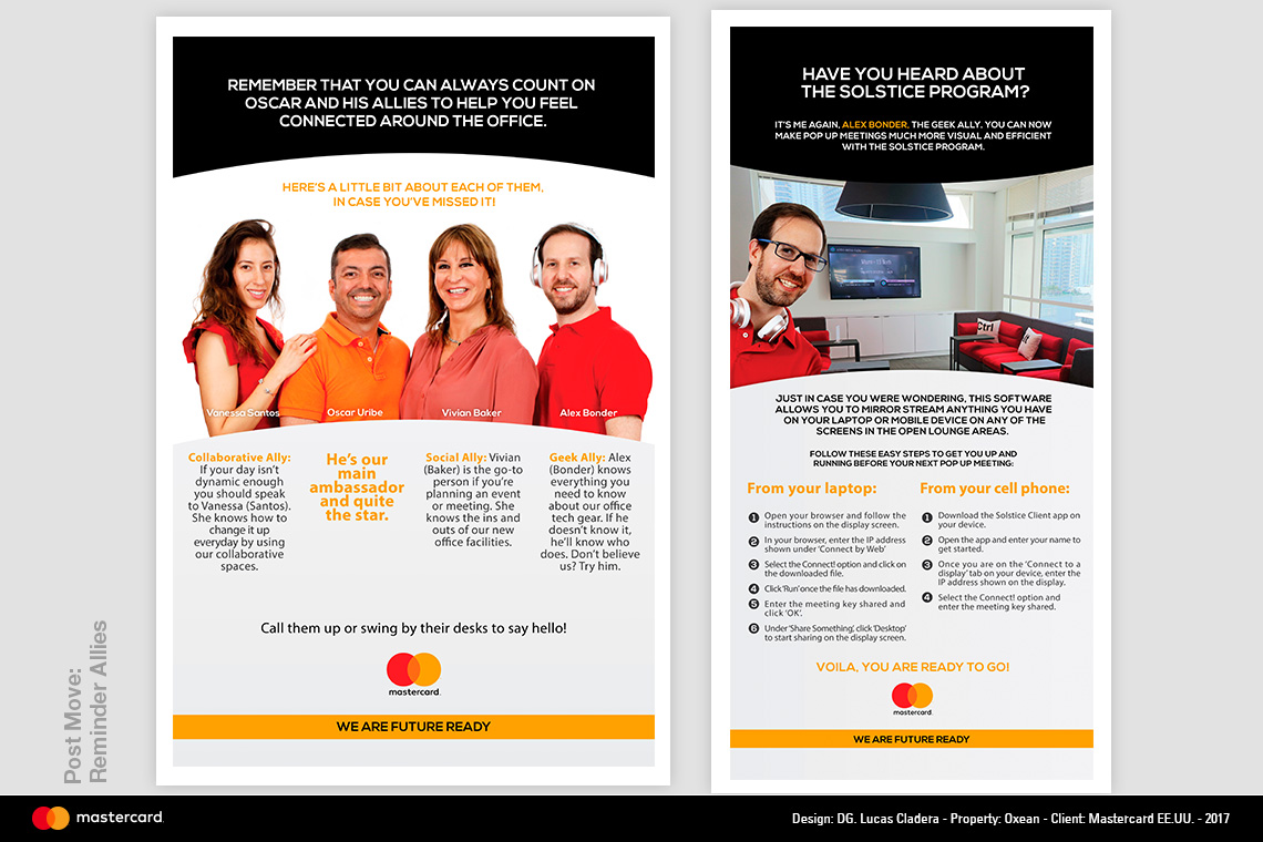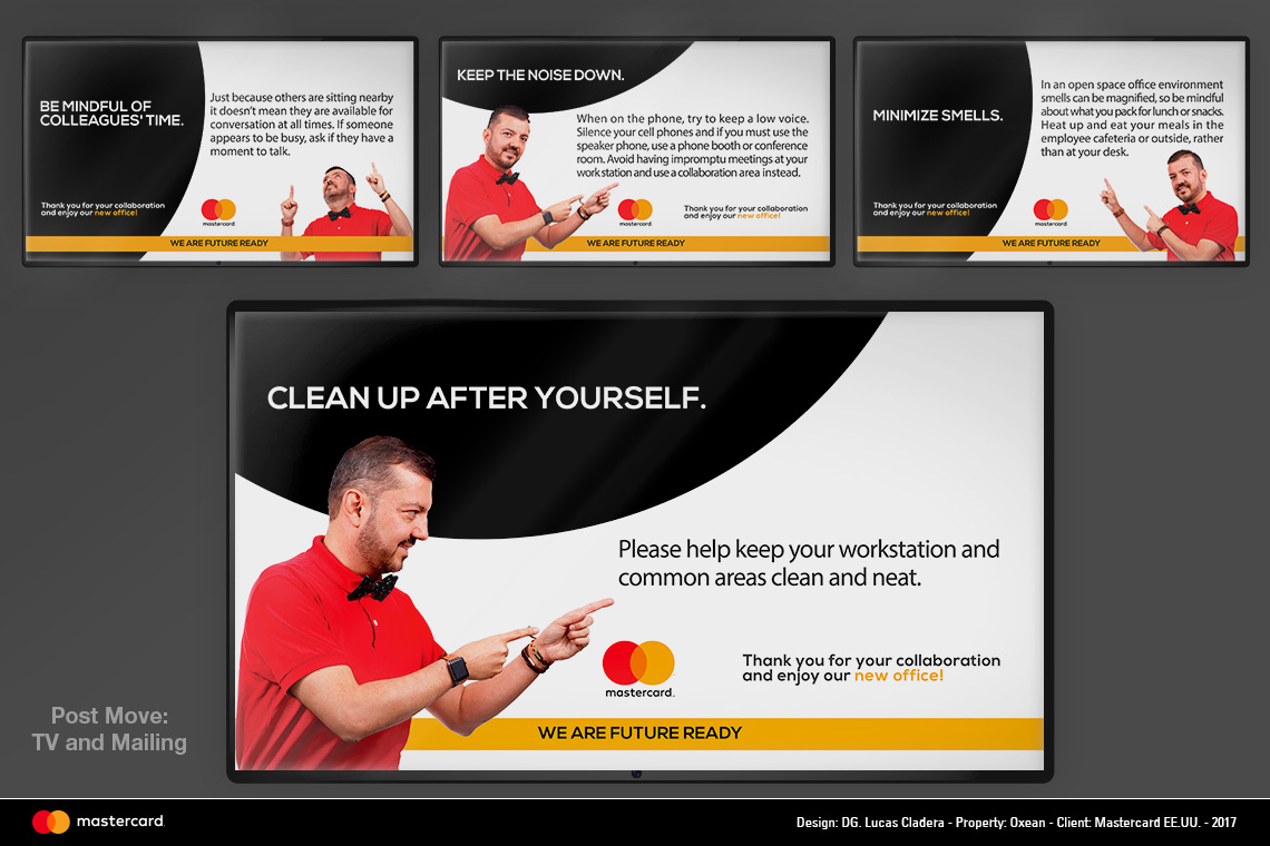 - Results: For Mastercard Miami, the relocation was more than a transfer of place. It implied a great change in the cultural concept of the company. Great success was achieved from a different and fun internal communication strategy. An ambassador (influencer) who was chosen by the employees themselves was in charge of spreading the campaign, facilitating the entire process. The campaign achieved great acceptance and enthusiasm for a new proposal and organization of the space “Moving to an open concept workspace”. A creative and outstanding proposal in internal communication that was also a candidate to participate in awards.