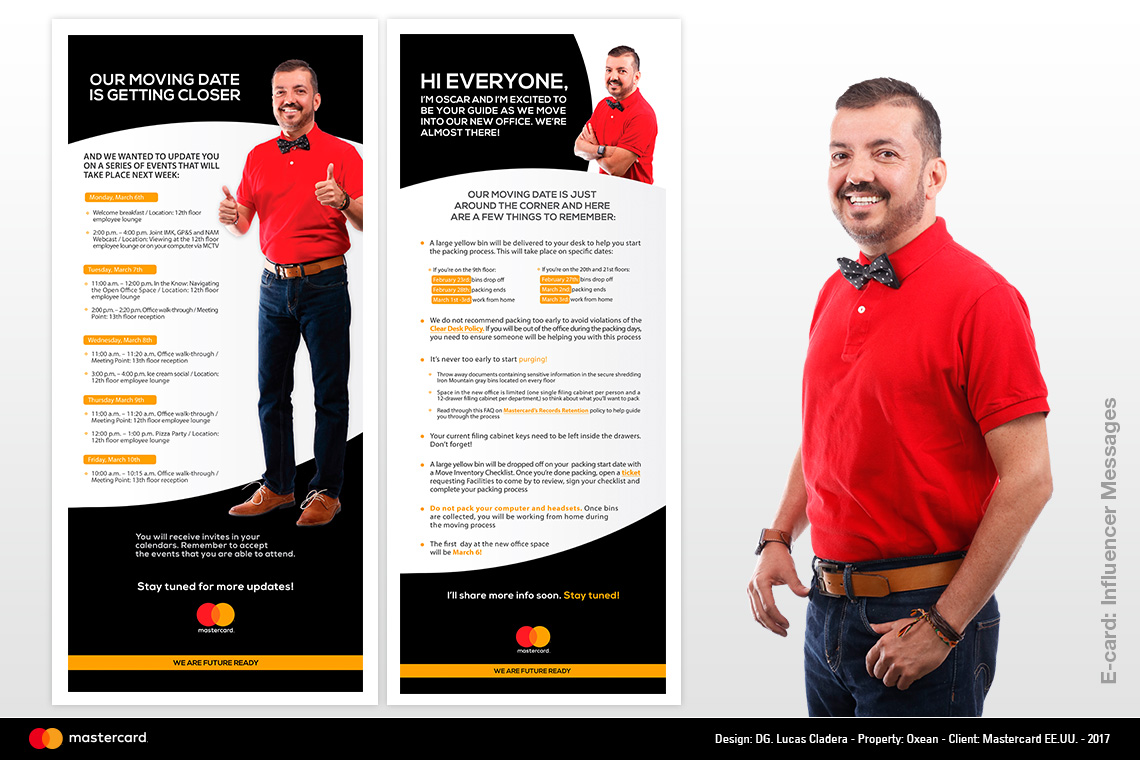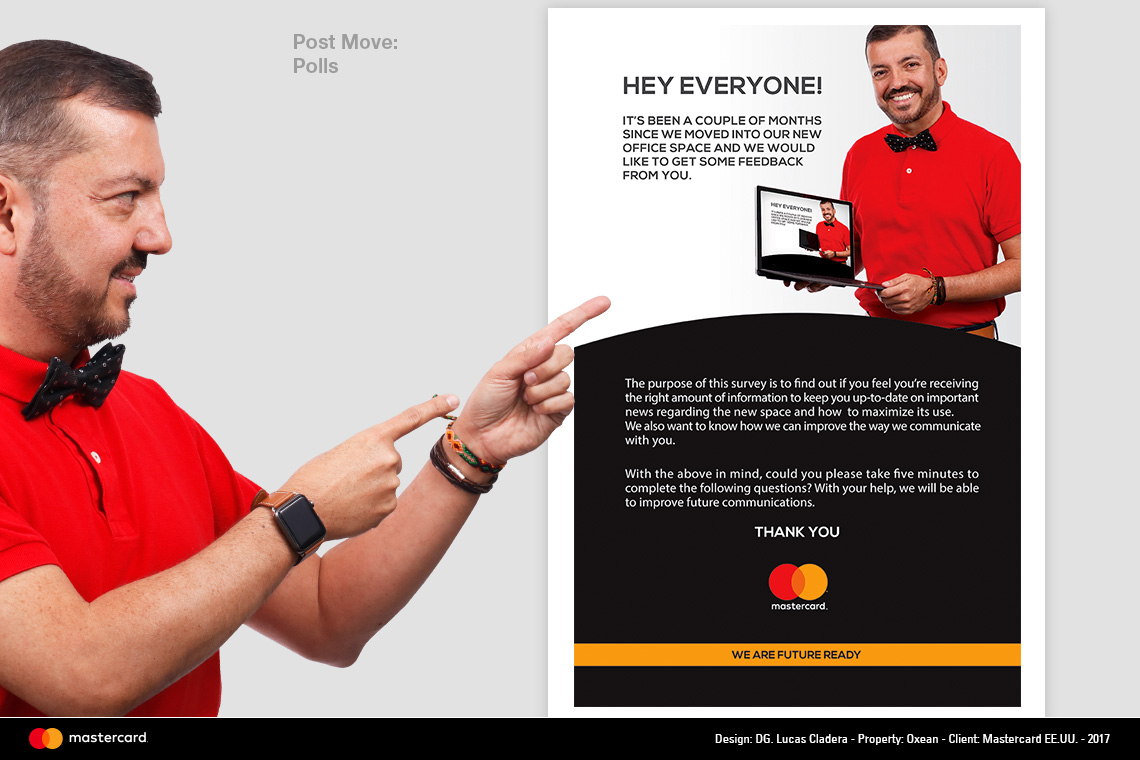 - Results: For Mastercard Miami, the relocation was more than a transfer of place. It implied a great change in the cultural concept of the company. Great success was achieved from a different and fun internal communication strategy. An ambassador (influencer) who was chosen by the employees themselves was in charge of spreading the campaign, facilitating the entire process. The campaign achieved great acceptance and enthusiasm for a new proposal and organization of the space “Moving to an open concept workspace”. A creative and outstanding proposal in internal communication that was also a candidate to participate in awards.